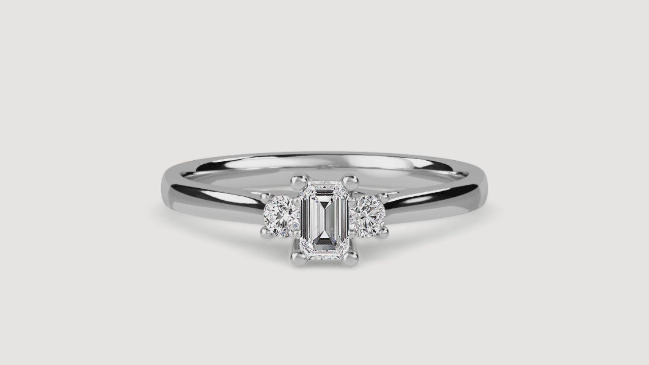 A timeless and elegant three-stone ring featuring a central emerald-cut diamond flanked by two smaller round diamonds. The classic design and sparkling stones make it perfect for everyday wear.