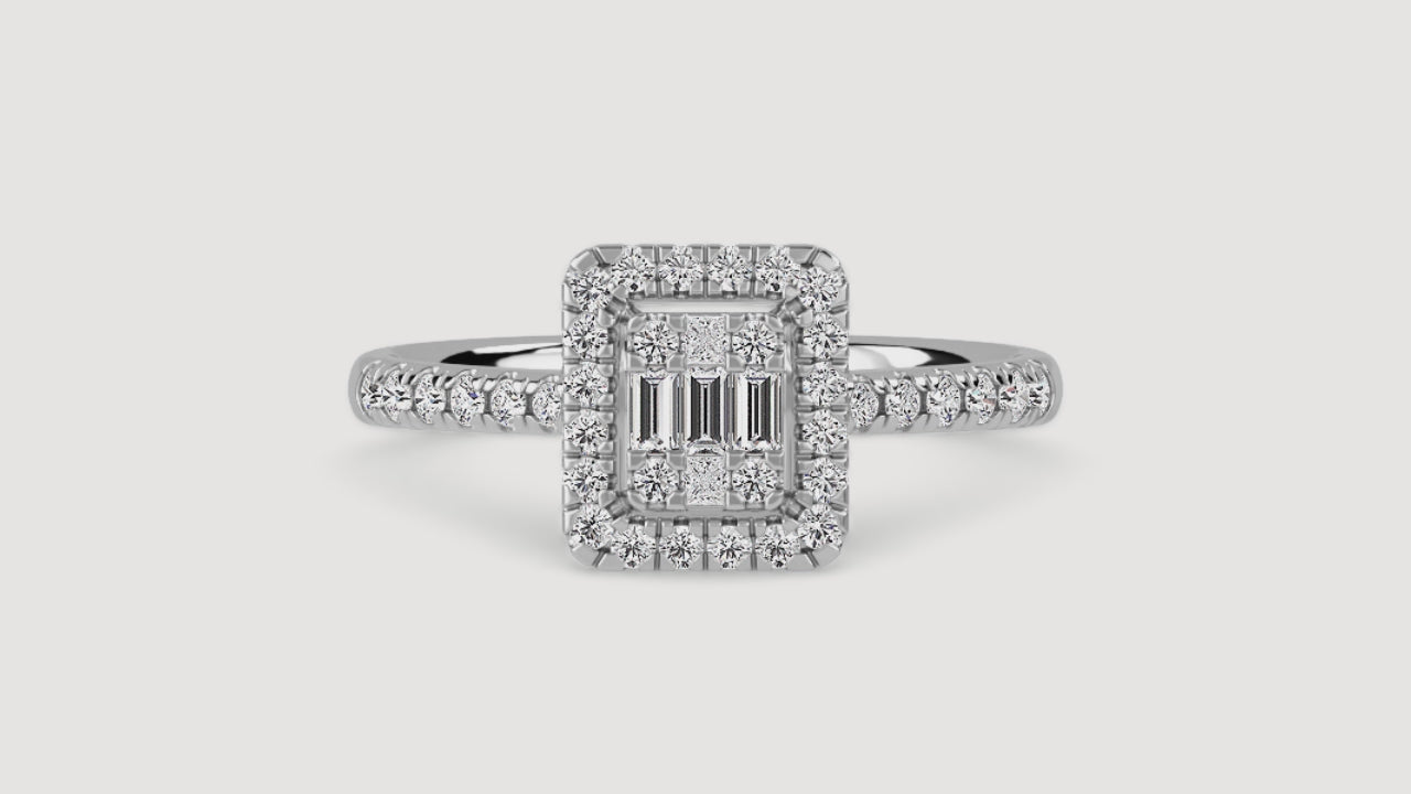 A sophisticated and stylish ring featuring a square-shaped setting with a baguette-cut diamond in the center. The surrounding halo of round-cut diamonds adds a touch of sparkle, making it perfect for everyday wear.