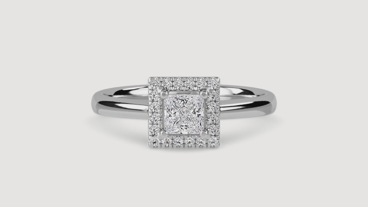 This fun and funky ring features a square-shaped setting with a princess-cut diamond in the center. Surrounding the diamond is a halo of smaller diamonds that add a touch of sparkle. It's the perfect everyday accessory to add a little pizzazz to your look.