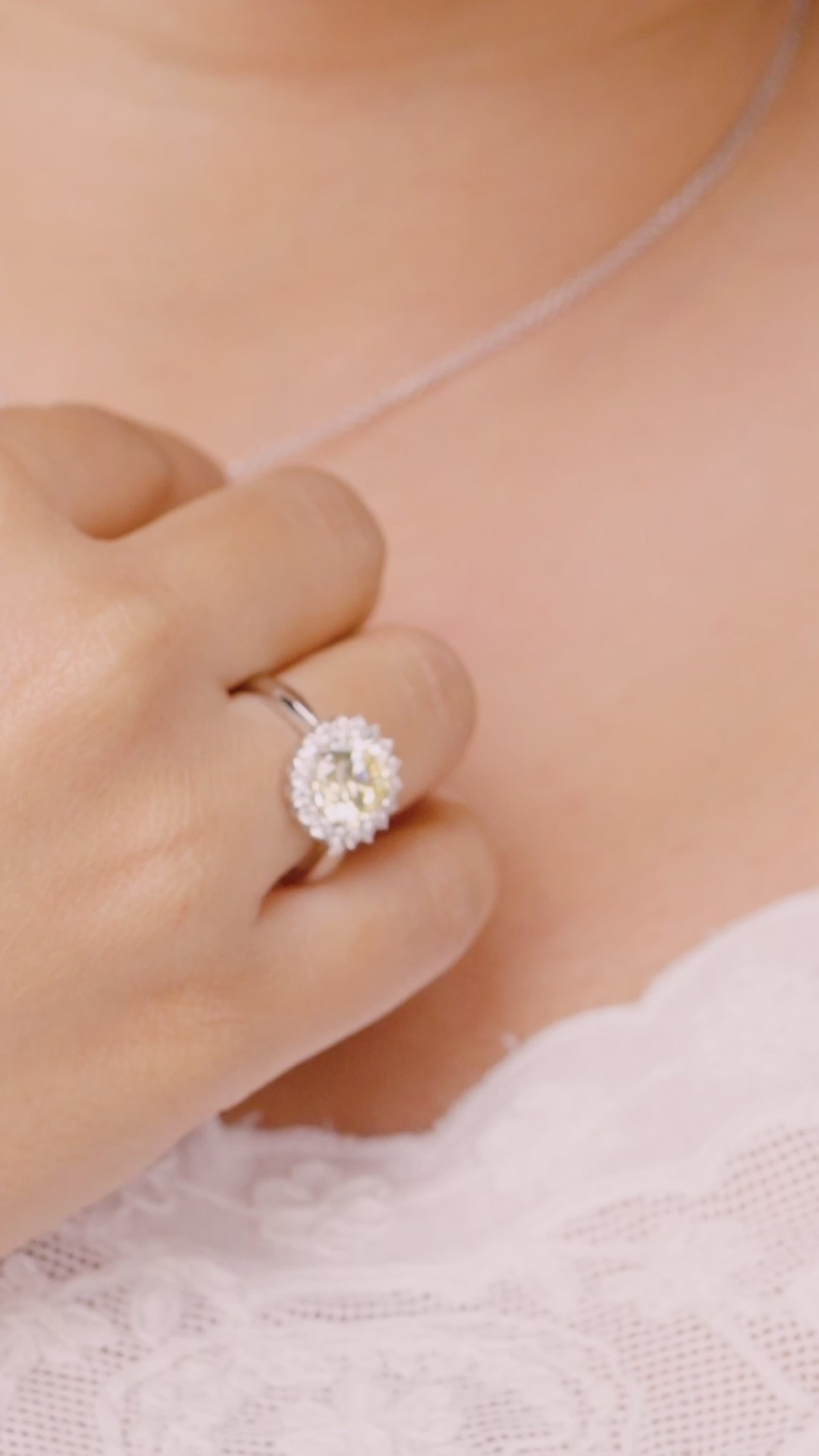 Capture the essence of golden hour with this dazzling ring. A radiant yellow center stone, reminiscent of a warm summer day, is embraced by a shimmering halo of diamonds, creating a truly captivating and sun-kissed look.