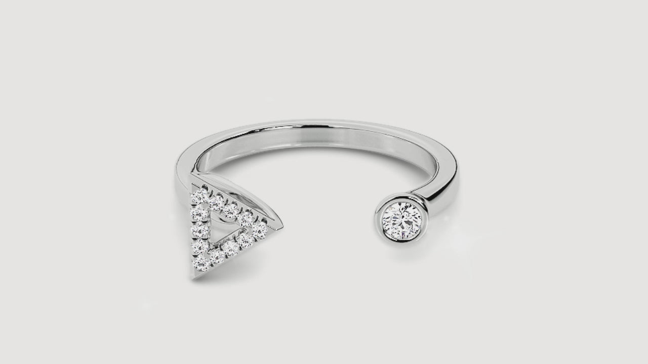 A sleek and modern ring featuring a diamond-encrusted triangle shape with a single, brilliant diamond accent. This minimalist design is perfect for everyday wear or special occasions.