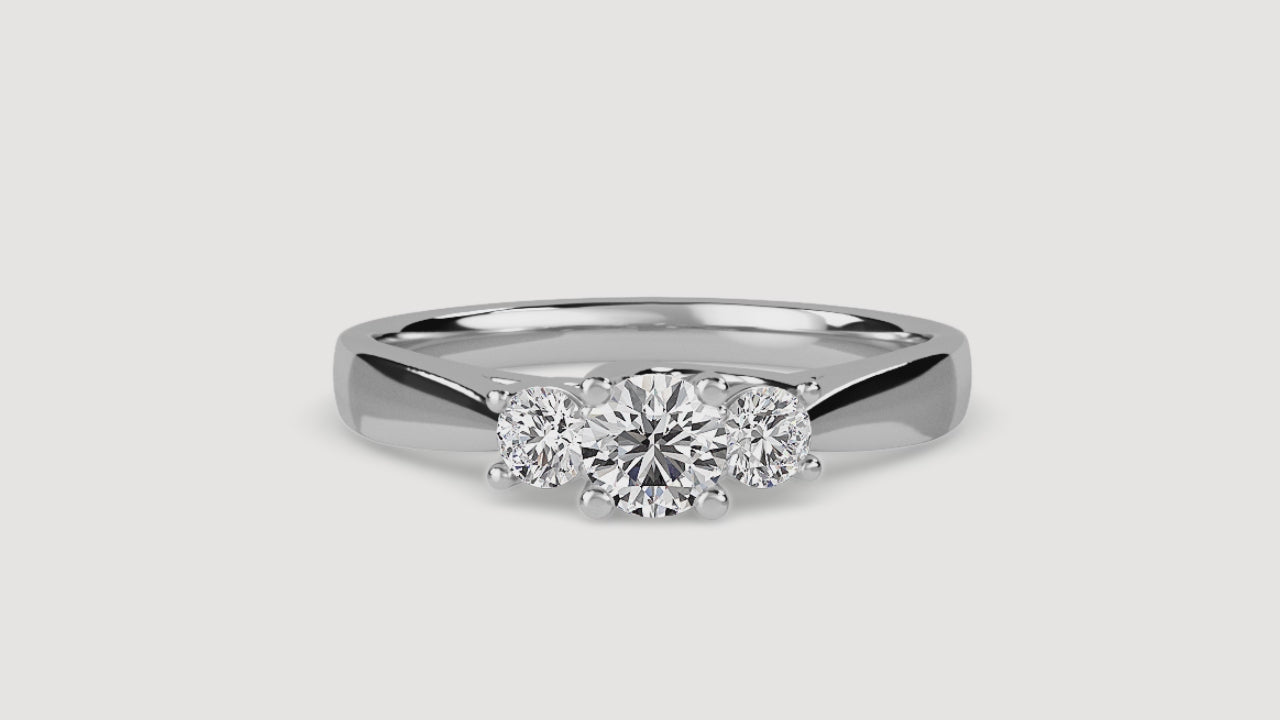This sparkling ring features a trio of round-cut diamonds set in a sleek, modern band. It's the perfect everyday accessory to add a touch of glam to any outfit.